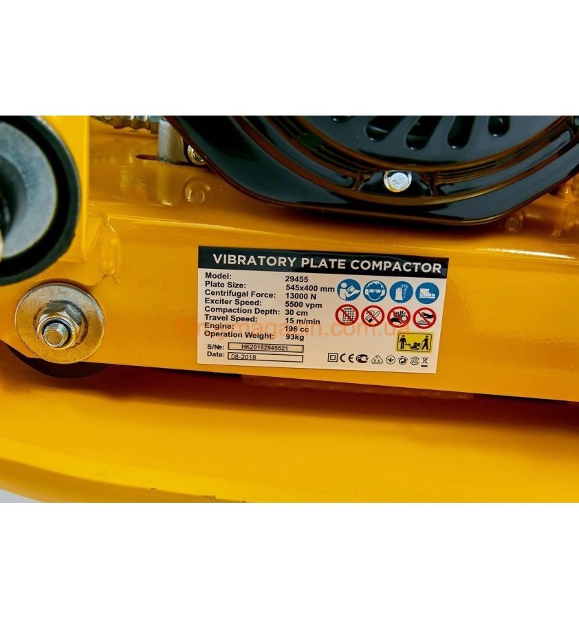 Бензиновая виброплита HONKER 29455+31510 новинка конца 2018 года. Единственная виброплита в данной линейке, которая оснащена бачком для воды. Имеет довольно хороший вес 95 кг. Установлен мощный двигатель 6,5 л.с., обороты двигателя 5500 об/мин. Сила уплотнения 13 кН. Глубина уплотнения до 300 мм. Подошва имеет закругленные края с размерами 545*440 мм. В комплекте идут транспортировочные колеса и бак для воды, коврик докупается отдельно.