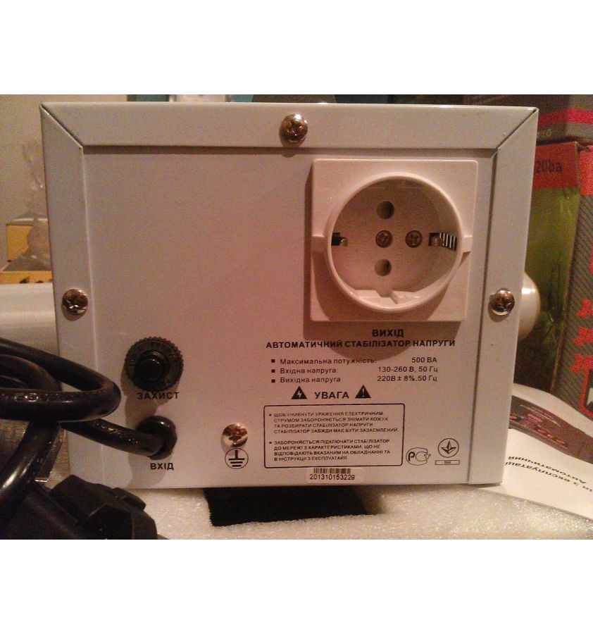 Стабилизатор напряжения Forte TDR-500VA: пределы входного рабочего напряжения 130-260В; напряжение на выходе 220В+/-8%; мощность 500ВА; частота тока 50 Гц; тип стабилизатора – релейный; цифровой вольтметр входного/выходного напряжения; защита от короткого замыкания? от перегрузки, повышенного/пониженного напряжения. Размеры упаковки: 233x110x152 мм. Вес 2,25 кг.